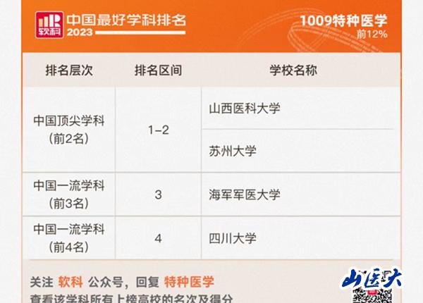11月8日,高等教育评价专业机构软科发布“2023软科中国最好学科排名”。我校特种医学、公共卫生与预防医学、基础医学、临床医学、护理学和马克思主义理论学等6个学科上榜。其中,特种医学学科位列全国第一,入选中国顶尖学科,也是山西省唯一一个入选的顶尖学科。我校特种医学继上一年度全国排名第一之后,本年度再次蝉联全国第一。作为肩负学校“双一流”突破重大使命的龙头学科,特种医学在省委、省政府的关心支持下,近年来发展势头强劲,先后获批国家级重点重大科研项目12项(国家基金委、科技部),其中国家级重大项目2项,2人获得国家级人才称号,李思进教授入围2023年度中国工程院院士有效候选人。