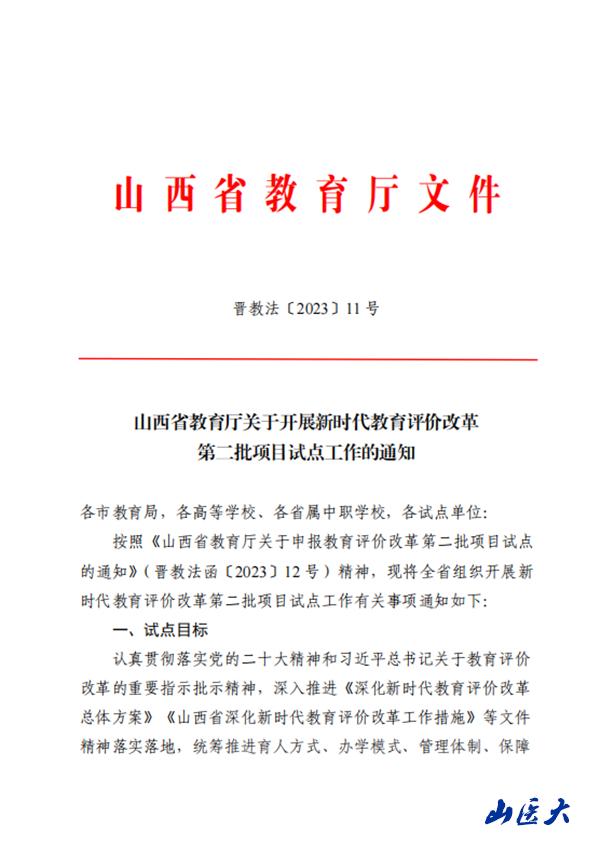 近日,山西省教育厅发布了《关于开展新时代教育评价改革第二批项目试点工作的通知》,由我校党委宣传部牵头申报的“坚持把立德树人成效作为根本标准”和教务部牵头申报的“严格学业标准”两个项目成功获批新时代教育评价改革第二批项目试点。