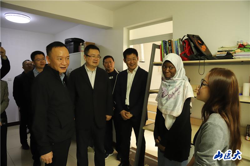 随后,调研组前往留学生公寓实地走访。王昱仔细查看了留学生的居住环境与生活设施,详细询问生活配套服务情况。在与留学生的亲切交流中,他关心地询问留学生的生活感受、学习适应情况和文化融入体验,留学生们热情分享在校学习生活点滴,纷纷表示学校完善的设施与贴心的关怀,让他们体会到家一样的温暖。王昱充分肯定了我校留学生管理工作的规范性与细致性。他强调,留学生教育是高校国际化办学的重要体现,更是促进中外文化交流、增进民心相通的关键桥梁。学校要充分发挥留学生的文化交流使者作用,鼓励他们积极传播中国声音,讲好中国故事,为构建人类命运共同体贡献力量。