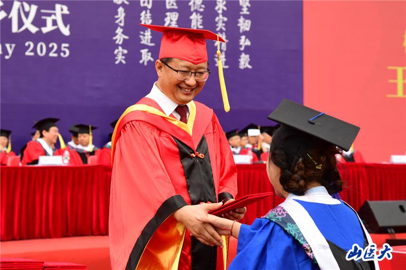 典礼上,校党委书记王军为优秀毕业生代表颁发证书,希望大家牢记“医理博精、德能高邃”校训、发扬“献身、务实、团结、进取”校风和传承“求实精进、坚韧弘毅”的山医精神,在青春的赛道上奋力奔跑,力争跑出当代青年的最好成绩。
