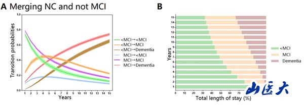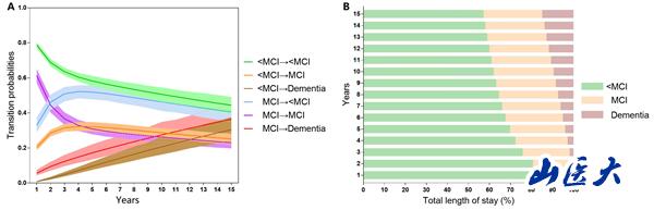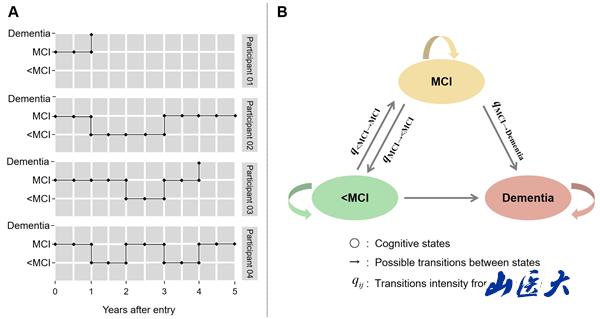 Figure 1 Possible transition paths for the selected participants (A) and transitions numbers between transient states (<MCI, MCI) and absorbing state (Dementia) (B)