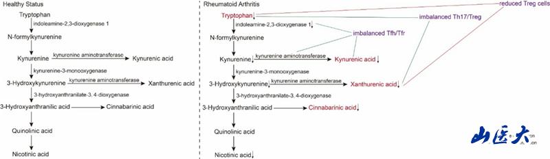 进一步机制研究发现,色氨酸代谢产物失衡与Th17/Treg、Tfh/Tfr细胞免疫失衡密切相关。其中,色氨酸和黄尿酸水平降低与Th17/Treg失衡呈负相关,犬尿酸减少则直接关联Tfh/Tfr细胞比例失调。这一发现首次在代谢异常与免疫紊乱之间架起科学桥梁,证实犬尿氨酸途径是RA免疫失衡的关键上游调控机制。