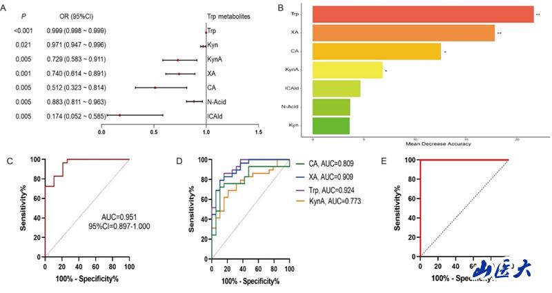 作为全球影响超4000万人的慢性疾病,RA的发病机制一直被视为医学难题。王彩虹团队通过靶向代谢组学技术,对初诊RA患者血清进行深度分析,发现患者体内色氨酸代谢网络显著异常,尤其是犬尿氨酸(Kyn)代谢途径紊乱最为突出。研究首次筛选出色氨酸(Trp)、黄尿酸(XA)、喹啉酸(QA)、犬尿酸(KynA)4种核心代谢物,构建的RA-HC代谢诊断模型不仅能精准区分患者与健康人群,还可根据代谢物水平将病情分为轻、中、重三级,为个体化治疗提供了量化依据。