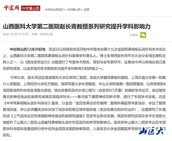 今年以来,赵长青还应首都医科大学北京同仁医院、复旦大学眼耳鼻喉科医院、上海交通大学第一和第六人民医院、上海同济大学东方医院、陆军军医大学长海医院、中山大学附属第一医院等邀请,以所承担的6项国家自然科学基金课题为基础,结合发表在国内外核心期刊(含系列SCI文章)发表的学术论文,就过敏性鼻炎的神经免疫机制研究成果及其临床转化——鼻内镜下翼管神经切断术等,进行了专题学术讲座。还应《中华耳鼻咽喉头颈外科杂志》邀请,以全国“变应性鼻炎诊疗指南”指南执笔起草专家身份,参加了指南首场讲座,并以主讲嘉宾身份参加了该杂志的第五场专题讲座(变应性鼻炎的外科治疗),应邀撰写了长篇综述《上气道高反应性疾病的神经免疫机制研究进展》在该专业杂志发表。其系列研究成果及学术交流极大地提升了山医大二院及山西省耳鼻咽喉头颈外科在国内的声誉和影响力。连续多年山医大二院该专业在中国医学科学院科技量值排行榜中名列全国百名医院榜单靠前,入选复旦大学全国医院声誉榜华北地区提名医院前列。